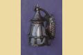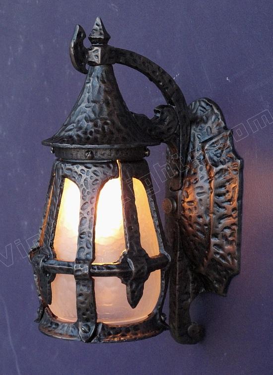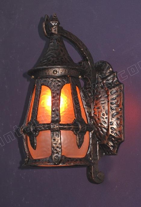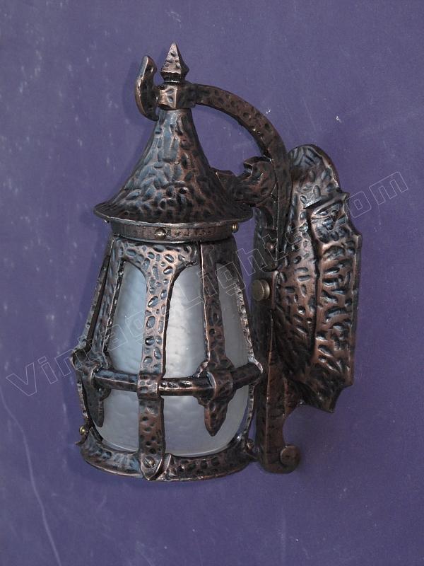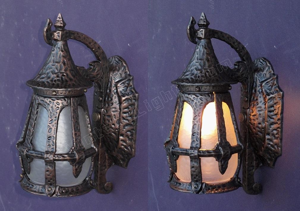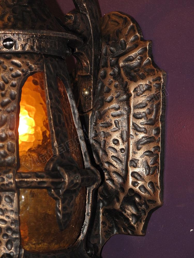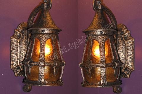 Late 20s to early 30s with that wonderful Tudor, Storybook, cottage look and feel. Hammered body cast to look like hand forged. Hard to find porch lights with original glass. We see a few of these occasionally, but rarely with their glass intact. These have retained their original amber textured glass intact. Refinished in an oil rubbed bronze color.