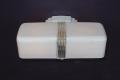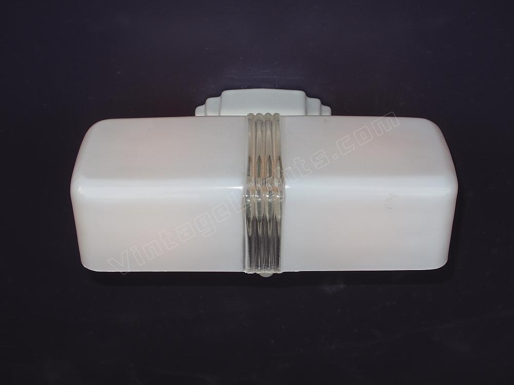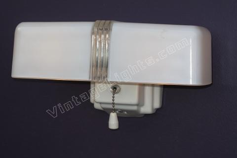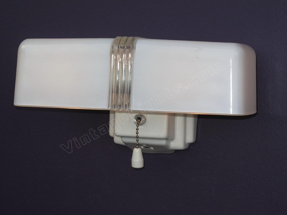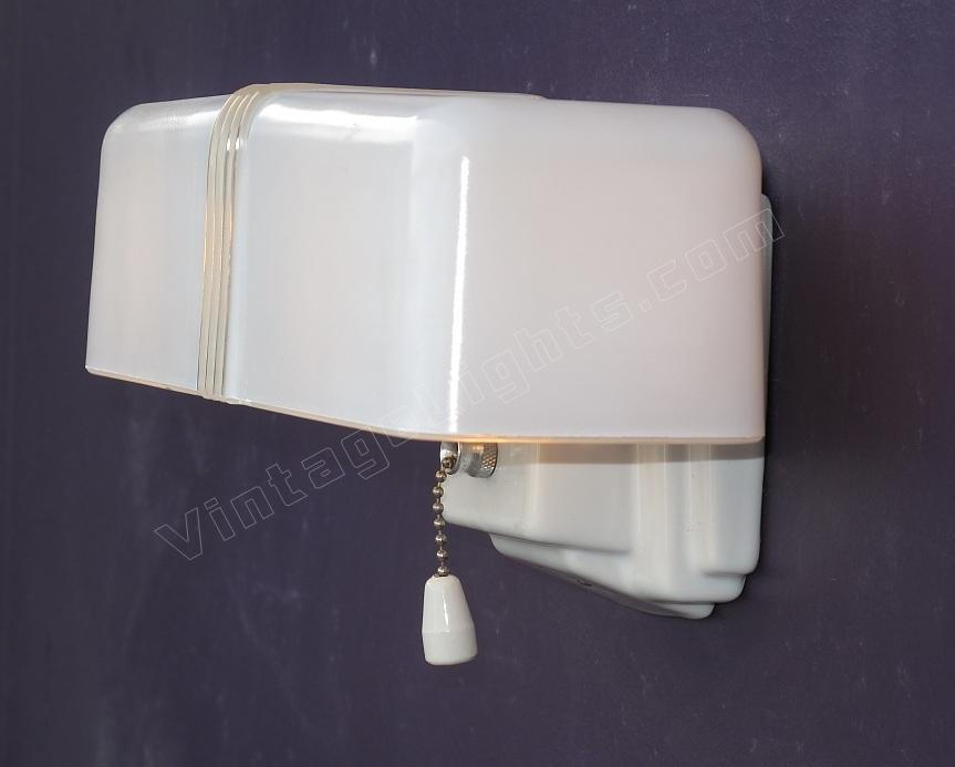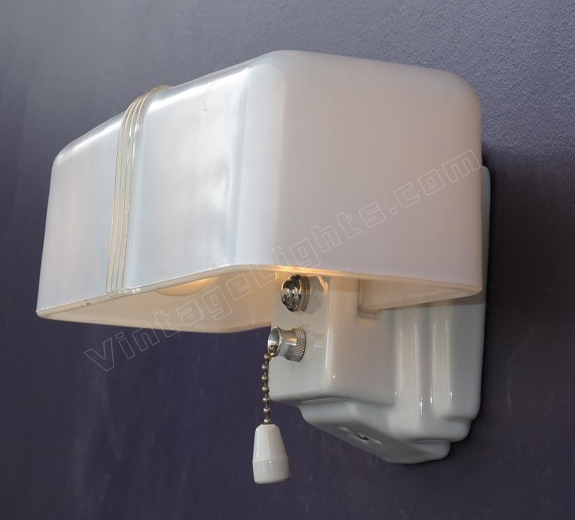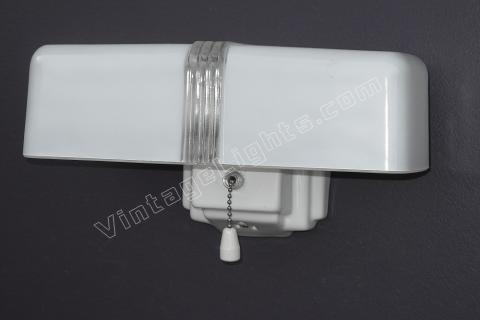 Classic vintage design and style from the 20s & 30s when the white porcelain "sanitized" was still popular for bathroom and kitchen lighting fixtures. The antique shade will allow for money saving CFL bulbs. The antique pull chain switch on this lighting fixture pulls and clicks smoothly, as it should. And as always, the outlet has been disabled for safety concerns.