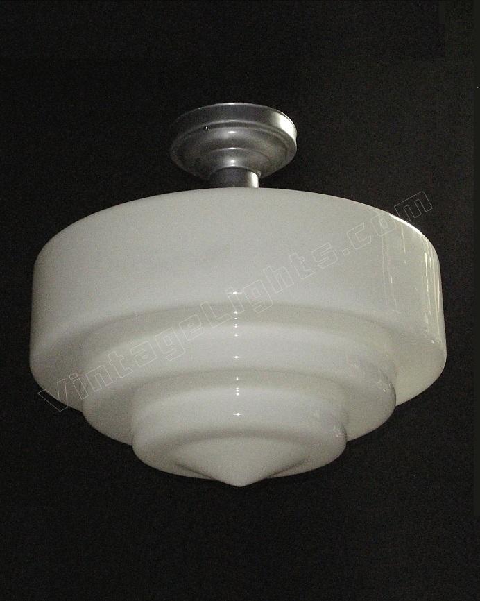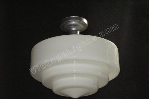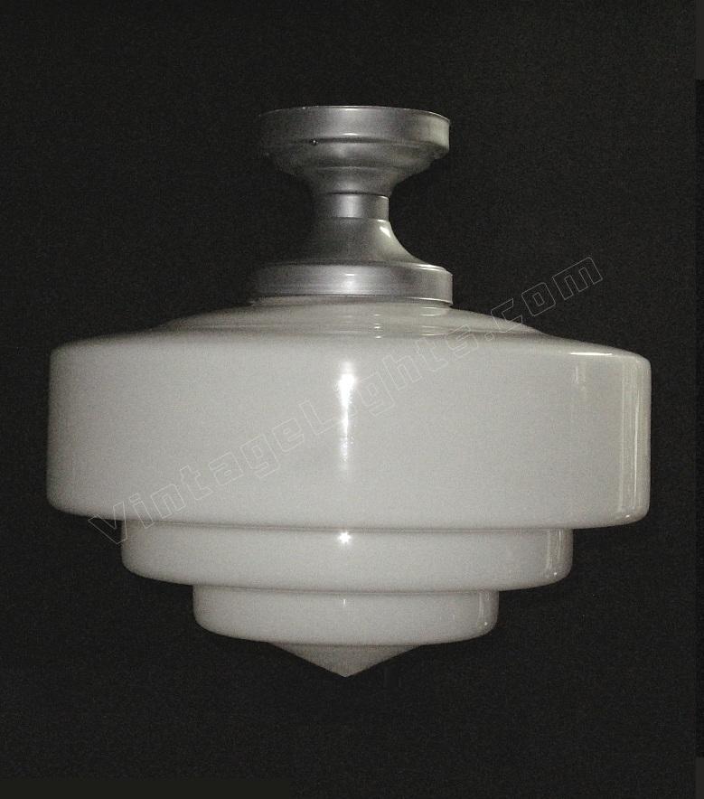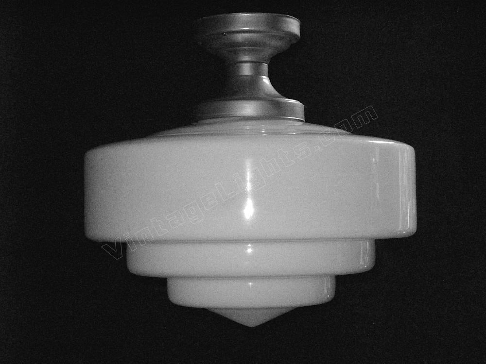 Although shown on a vintage flush mount ceiling fitter in brushed metal, any of these schoolhouse lights can be dropped on a chain or pole if a pendant look or longer drop is required. The fitter is also available in chrome / nickel or painted to match your interior. Alterations from the shown flush mount ceiling fitter in brushed metal are charged at our cost only. UL listing available at additional cost.